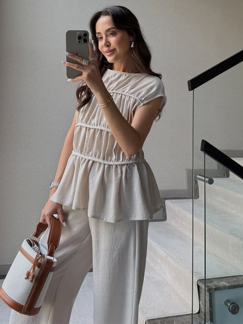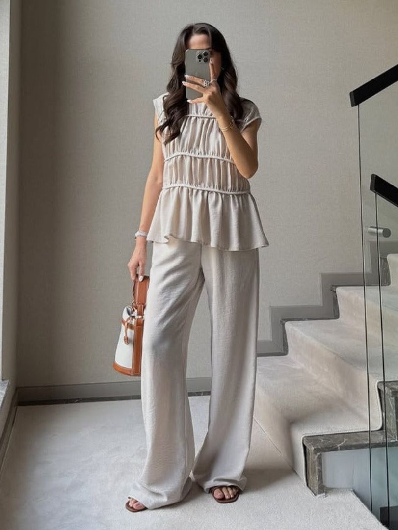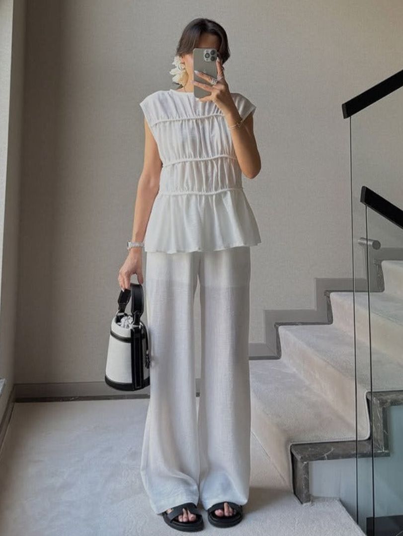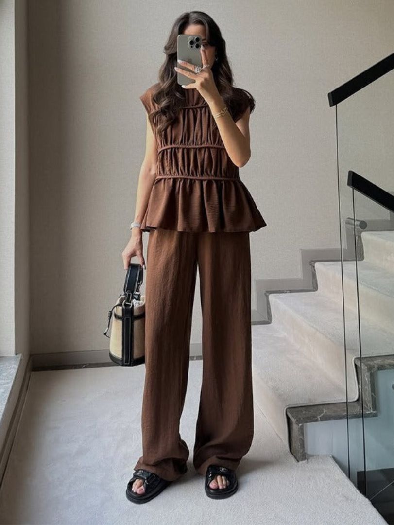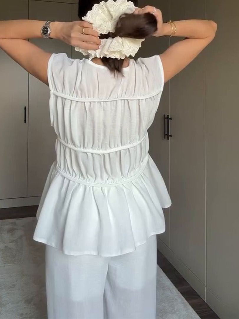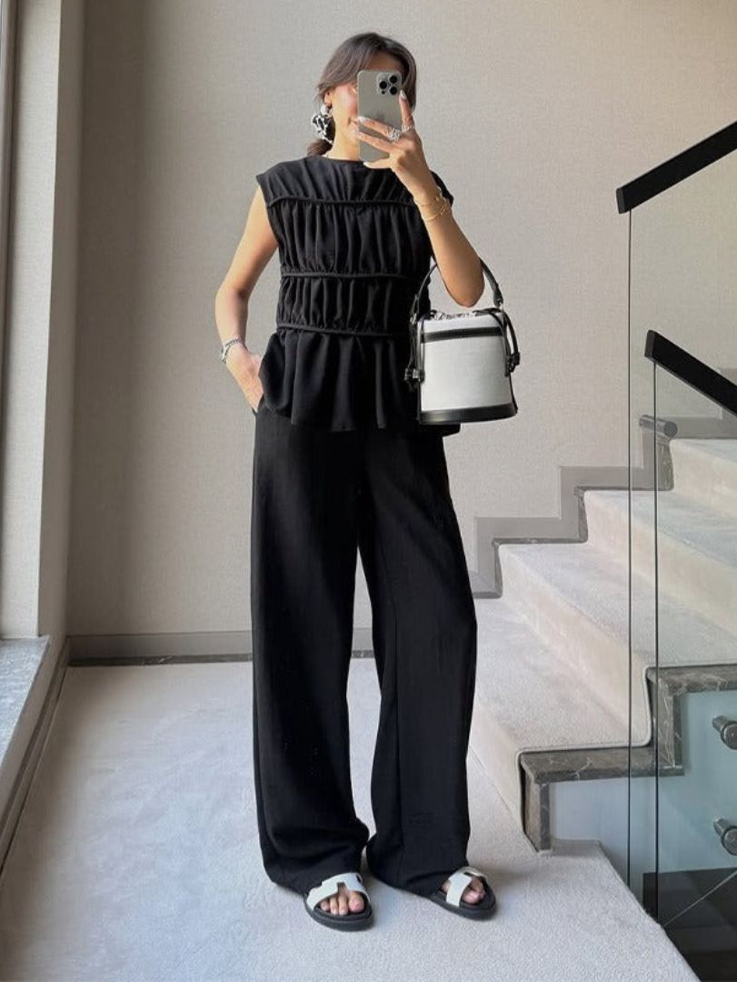 Adoptez un look à la fois chic et décontracté avec cet ensemble sans manches en tissu plissé, alliant confort et élégance. Sa coupe fluide et légère sublime votre silhouette tout en offrant une grande liberté de mouvement.