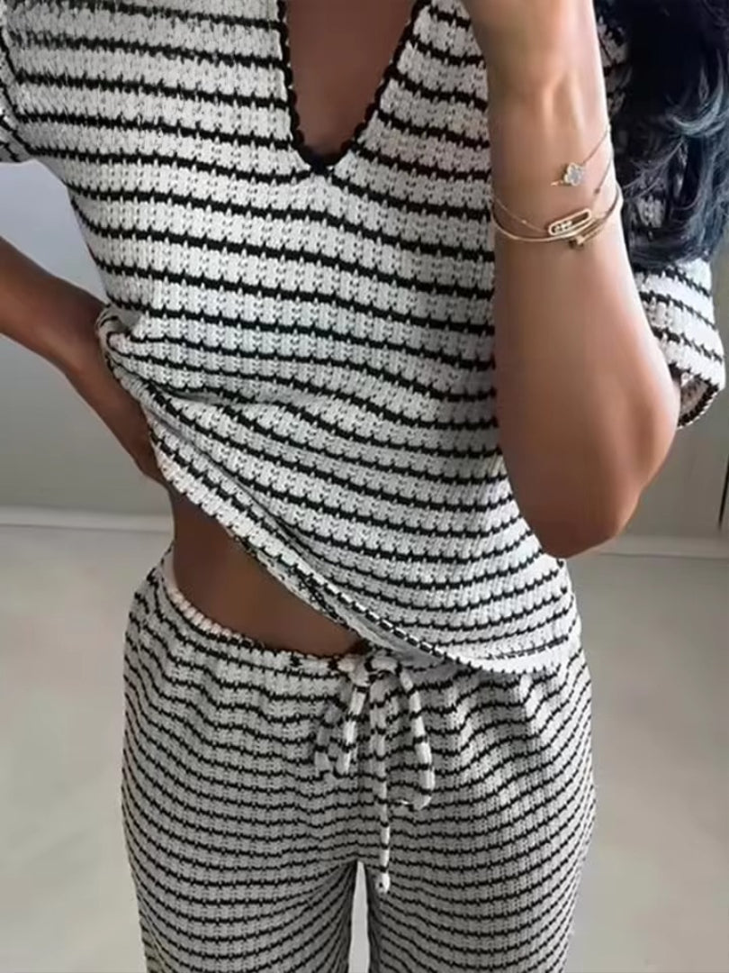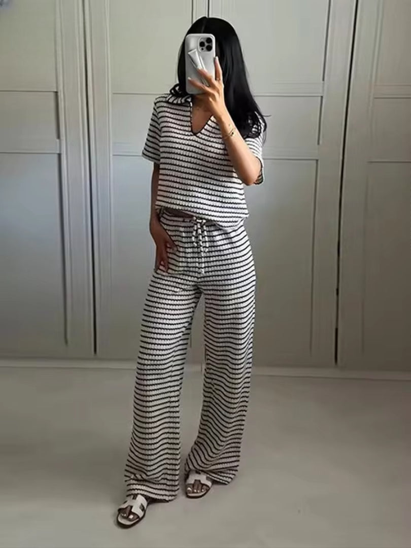 Adoptez une allure rétro et décontractée avec cet ensemble en tricot composé d’un haut rayé à manches courtes et d’un pantalon à jambe large à cordon. Confortable et stylé, il incarne l’équilibre parfait entre vintage et modernité pour vos journées estivales.