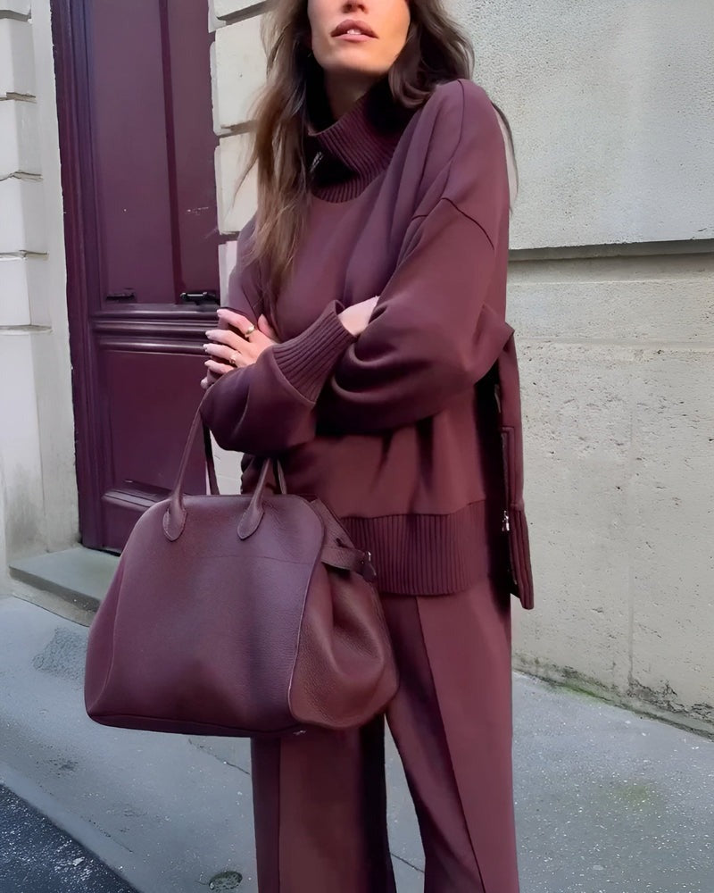 Confort absolu et style minimaliste pour cet ensemble en tricot composé d’un pull à coupe décontractée et d’un pantalon assorti. Parfait pour les journées cocooning ou les sorties décontractées, il allie douceur, chaleur et élégance effortless.