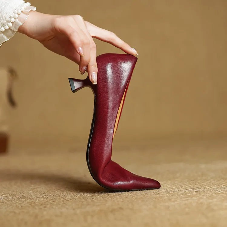 Un talon chaton effilé et un bout pointu équilibrent cette chaussure en cuir véritable épurée avec une semelle intérieure légèrement rembourrée, un choix élégant pour rehausser vos looks décontractés ou habillés.