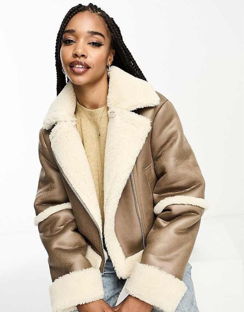 Une veste aviateur courte en imitation peau de mouton, alliant chaleur et style avec une touche rétro. Sa coupe moderne et sa texture douce créent un look tendance et confortable, idéal pour affronter la saison froide avec élégance.